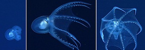 Figure.A. pelagicus photographed in ship-board aquaria off Hawaii. Left - Dorsal view of the same octopod as in the title photographs. Photograph by Steven Haddock. Center - Dorsoposterior view. Right - Side view. In latter two images, the octopod is crawling on the side of the aquarium (from Young et al., 1999).