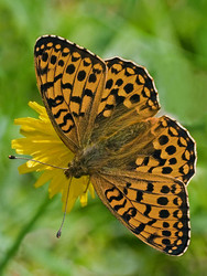 The tribe Argynnini, commonly known as Fritillaries, is a group of fairly uniform, small to medium sized butterflies. Almost all species have an orange-brown ground colour with a pattern of black spots and streaks on the upper side, and some pearly white to silvery white spots on the underside, particularly on the hindwing.