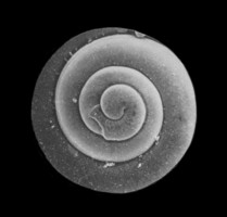 Atlanta fragilis was described by Richter (1993) from material collected from the tropical central Atlantic Ocean. The species shares the same eye, opercular, and radular types with other members of the A. peronii species group. Among these species, it is most similar to A. peronii in overall shell morphology, maximal shell size, and sexual dimorphism in the marginal teeth. The shell of A. fragilis is distinguished from other species by its thin, fragile walls (hence, the specific epithet, fragilis). Richter (1993) noted that the thickness of the wall in the fifth whorl is about 10 µm, compared with 22-25 µm in the fifth whorl in A. peronii. Other differences with A. peronii (cited in Richter, 1993 and in Richter and Seapy, 1999) include: (1) the keel, which is higher and penetrates deeper between the last two shell whorls in A. fragilis, (2) the keel base is clear, lacking pigmentation; in A. peronii the keel base of young individuals is clear, but becomes light brown to dark yellowish-brown with age, (3) the size of the eye lenses in adult animals is more than twice as large in A. fragilis; (4) the radula is longer and wider in A. fragilis, (5) the maximal number of tooth rows is higher in A. fragilis (70 compared with 60 in A. peronii), and (6) the spire of the larval shell is somewhat flatter in A. fragilis (see apertural views of larval shells of A. fragilis [above] and A. peronii [below]); although this difference is not seen in the spire of the adult shell. Lastly, Richter (1993) reported vertical distribution data for A. fragilis from opening-closing MOCNESS net tows taken during METEOR Expedition 51 in the tropical central Atlantic. Of the 135 adult specimens collected, about half were from 0-100 m tows and the other half were from 100-250 m tows. No information was included about the times of the tows, and so the possibility of nocturnal vertical distribution could not be assessed.