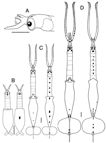Figure. Paralarval stages of C. picteti from Hawaiian waters (Young, 1991): A - Side view of head, 2.4 mm ML; note the virtual absence of a brachial pillar at this stage. The esophagus within the brachial pillar (apparent in later stages) occupies a central position. B - Ventral and dorsal views, 2.8 mm ML. C - Ventral and dorsal views, 7.7 mm ML. D - Ventral and dorsal views, 12 mm ML. The median chromatophore between the eyes on the ventral surface of the head is an important systematic character. Scale bar is 1 mm. Drawings from Young (1991).