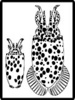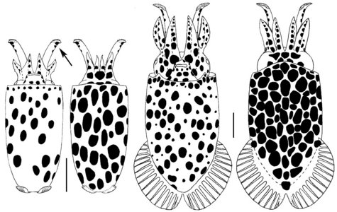 Figure. Left - The thumbnail shows relative sizes of the two paralarvae. Right - Dorsal and ventral views of two sizes of paralarvae of Chtenopteryx sp. from Hawaiian waters. Left - 3.2 mm ML paralarva. Right - 5.4 mm ML paralarva. Drawings by R. Young. Scale bar is 1 mm.