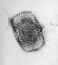 Comments | Electron micrograph of a Vaccinia Virus. Vaccinia virus is normally confined to cattle, but is conveyed to humans through vaccination, thereby, imparting immunity to the smallpox virus. |