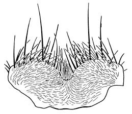 - distinctive head setation (setae on disc of head more or less radiating anteriorly, laterally, and posteriorly from a point near middle of frons, setae on base of head directed anteriorly and a narrow band of setae on inner margin of eyes directed anteriorly and antero-medially; setation of E. strigella directed anteriorly and antero-medially);