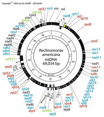 Figure 6. Map of the mitochondrial genome of the jakobid Reclinomonas americana. Red type denotes idenitified protein-coding genes that were only known from jakobid mitochondrial genomes (note that three of these are, in fact, present in Malawimonas, which is not specifically related to jakobids). The genes rpoA, rpoB, rpoC and rpoD encode subunits of eubacterial-type (α2ββ’σ) RNA polymerase. © 2000 OGMP