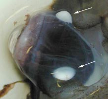 Figure. Ventral view of damaged eye of a fresh Mp. hjorti, western North Atlantic. Arrows point to photophores. Photograph by M. Vecchione.