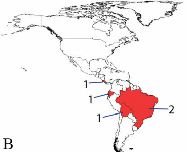 Figure 4. Geographical distribution for the known species of the genus Epsilogaster (A) and Mendesella (B) (Braconidae: Mendesellinae). The numbers on the figure represents the number of species by country of locality. Images copyright© 2006 Alejandro A. Valerio.