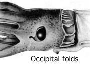 - Head with three primary (ventro-lateral) occipital folds in all genera; 3-8 secondary occipital folds also present in some genera (Onychoteuthis, Ancistroteuthis, Notonykia).