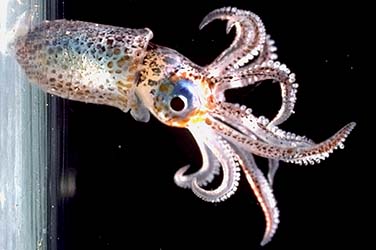 Young Onykia, like the ca 10 mm ML squid in the photograph (below left), are common members of the oceanic neuston. They are often associated with floating debris and have a bluish iridescence. Even at 25 mm ML (below right) some species may still be neustonic.