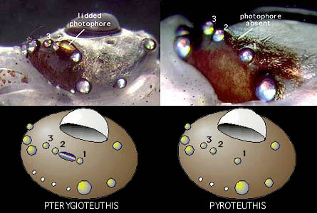 Figure. The arrangement of ocular photophores differs between Pterygioteuthis (left) and Pyroteuthis (right) in that the latter lacks the large lidded photophore and has fewer minute photophores. Note the irridescence from iridophores within the large, non-lidded photophores.