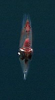 Figure. The pointed conus of the gladius is visible in this photo. The posterior abdominal photophore is nestled in the conus. The blurred region to the right (anterior) of the posterior abdominal photophore is the edge of the broken skin. Note the two mid-abdominal photophores farther anterior in the midline.