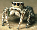 Jumping spiders are charming spiders that look up and watch you. Their excellent vision allows them to hunt much as do cats, spotting prey from long distances, creeping up then pouncing using their jumping ability. Although a jumping spider can jump more than thirty times its body length, none of its legs has enlarged muscles. The power for jumping probably comes from a quick contraction of muscles in the front part of the body increasing the blood pressure, which causes the legs to extend rapidly much as in the toy frogs that hop when you squeeze a bulb.