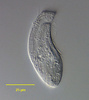 Comments | Portrait of the colorless benthic marine protist, Stephanopogon apogon (Borror, 1965)attempting (ambitiously) to ingest a large diatom. |