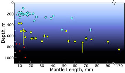 During a study of vertical distribution off Hawaii, S. hoylei was captured at depths of 375-850 m during the day with most captures at depths greater than 500 m. At night captures were made at depths from 100-500 m. During both the day and night there is a size/depth trend with larger squid tending to be caught at greater depths.