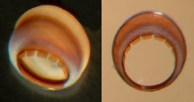 figure. Large arm suckers of T. borealis. Left - Distal-oral view of whole sucker (sucker 11 of arm II, 240 mm ML). Middle - Oral view of inner ring of same sucker. Right - Oral view of whole sucker (arm III, about 300 mm ML). Photographs by R. Young.