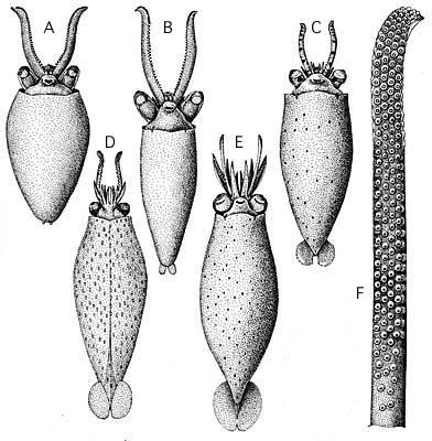 Figure. A - 7 mm ML. B - 10 mm ML. C - 27 mm ML. D - 57 mm ML. E - 85 mm GL. F - Tentacle of 10 mm ML squid. Note that the club and stalk suckers are separated where a slight decrease in sucker size occurs. Superficially the tentacle appears to be an elongate club. This is an important feature in distinguishing Teuthowenia paralarvae from those of other cranchiid genera.