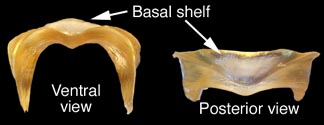 On some shells a ledge, called the basal shelf, extends anteriorly or posteriorly from the inner (= anterior) side of the saddle.