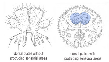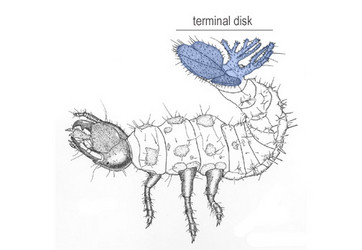 - Lacinia shorter than galea; dorsal plates of terminal disk subrectangular, only slightly wider at apex than base, deeply divided medially; lateral plates elongate and slender; lobe A robust, distinctly shorter than lobe B; lobe D very small