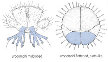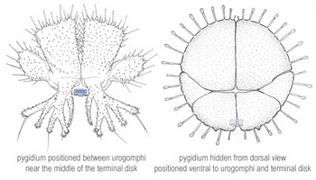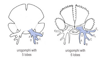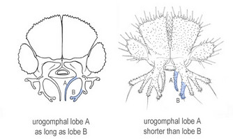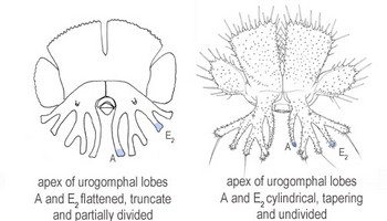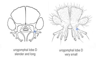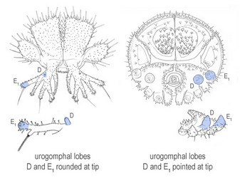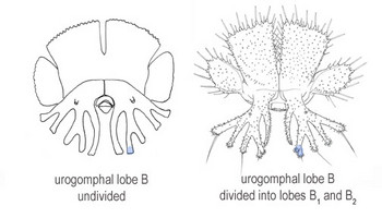 - Urogomphi with lobes A and E2 cylindrical, tapering to the tip and undivided; lobe B divided into B1 and B2 lobes