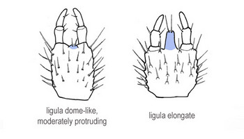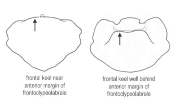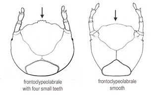 - Transverse keel well behind anterior margin of frontoclypeolabrale; labral tooth wide, slightly rounded anteriorly, clearly visible in dorsal view; prementum tapered from the base to the apex; urogomphi with short, flattened and partially fused lobes, lobes D and E1 pointed at tip; dorsal plates of terminal disk concave with large, protruding sensorial areas near the middle