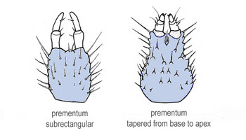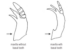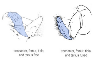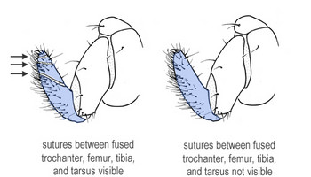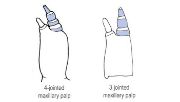 - First maxillary palpomere basally fused with stipes, resulting in a 3-jointed palp; trochanter, femur, tibia and tarsus completely fused, without sutures; sensilla S-I with simple truncate apex; sensilla S-II on margin of terminal disk present