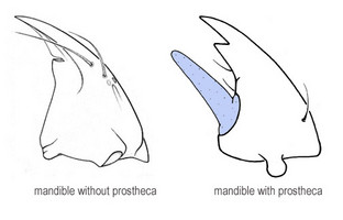 - Head prognathous; neck not constricted; coronal suture absent; sensorial appendage large, bulbous or conical on antennomere III; mandibles short and broad, subtriangular; urogomphi flattened, plate-like, not lobate; tarsi with 1 claw; pygidium positioned ventral to urogomphi and terminal disk (Paussini)