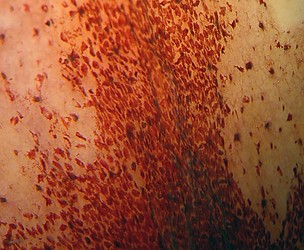 Figure. Ventral view of head skin of Mg. microlucens, 138 mm ML, showing regions with and without outer chromatophore layer intact. Photograph by R. Young.