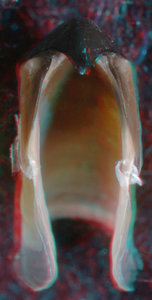 About anaglyph 3D: Photographs here are in 3D, using anaglyph techniques which combines two photographs one in red and the other in cyan (blue + green) color. To get the 3D effect, you must use glasses with red and cyan lenses (filters) over your regular glasses. The form of the beak is far easier to interpret in 3D and we strongly recommend to the viewer that the glasses be obtained (this is especially helpful when viewing enlarged images - i.e. click on the image). These beak photographs were made using Red and Cyan Anachrome Aviator Glasses (see: http://www.anachrome.com/glassbuy.htm or http://www.amazon.com) which cost under $10.00 (USD).