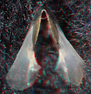 About anaglyph 3D: Photographs here are in 3D, using anaglyph techniques which combines two photographs one in red and the other in cyan (blue + green) color. To get the 3D effect, you must use glasses with red and cyan lenses (filters) over your regular glasses. The form of the beak is far easier to interpret in 3D and we strongly recommend to the viewer that the glasses be obtained (this is especially helpful when viewing enlarged images - i.e. click on the image). These beak photographs were made using Red and Cyan Anachrome Aviator Glasses (see: http://www.anachrome.com/glassbuy.htm or http://www.amazon.com) which cost under $10.00 (USD).