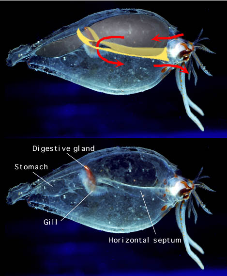 Figure. Identical side-view photographs of the cranchiid, Megalocranchia fisheri. Superimposed on the upper one are illustrations of the buoyancy coelom, the horizontal septum and the path of water for ventillation.