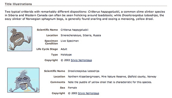 The names of page authors are printed at the top of the page, and their contact information is printed in the About This Page section near the bottom of the page. The authors' names at the top function as links to the About This Page section. Contributors' addresses, emails, and homepage urls are retrieved from the registration data in the ToL database, so page authors don't have to worry about entering these data once a person has been registered. Acknowledgments of funding agencies or people who helped in the creation of a page are also featured in this section, along with statistics about the page's publication and revision history.