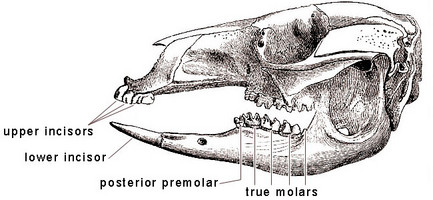 Skull of Bennett's wallaby, Macropus rufogriseus. Note the large incisors that dominate the lower jaw, as well as the gap where canine teeth are in other mammals in the upper jaw.